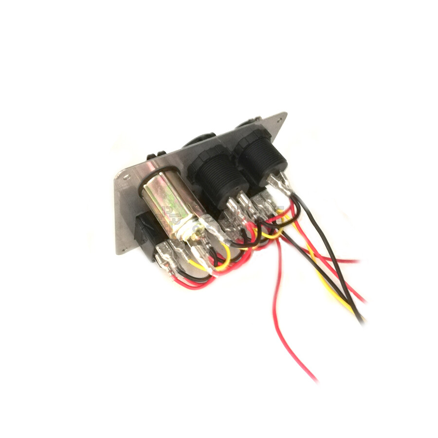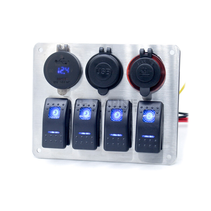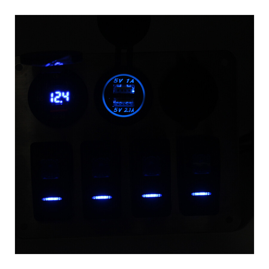 RVS 316L Schakelpaneel, 4 voudig, Sigaretten Aansteker, 2x Dubbele USB Aansluiting met voltmeter, 12-24V, Rode LED, IP65